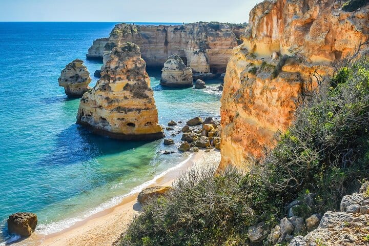 Continue to Praia da Marinha, one of the world's most beautiful beaches. Capture the iconic M-shaped sea stacks and twin arches. Focus on grand coastal landscapes, using long exposure for smooth water and capturing the vivid color contrast of turquoise water and golden cliffs.
